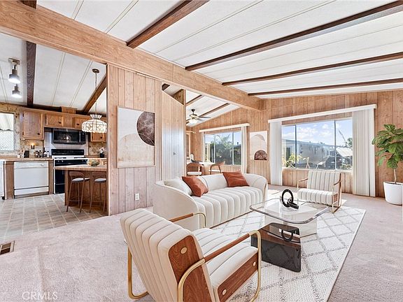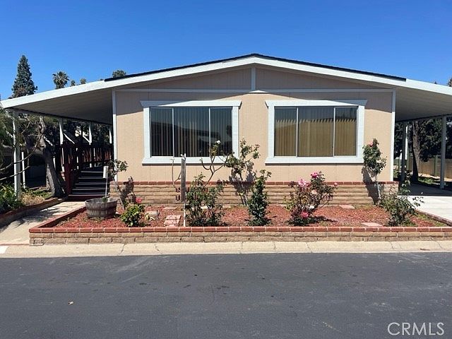 WE JUST FINISHED THE EXTERIOR MAKE OVER INCLUDING a BRAND NEW ROOF, NEW DRIVEWAY, NEW EXTERIOR PAINT, REFURBISHED PATIO, NEW WINDOW TRIM, NEW SKIRTING ALL AROUND, NEW FACIA BOARDS ALL AROUND, and professionally leveled, just too much good stuff! Introducing Orange counties' best kept secret!... Santiago Creek Estates, Peaceful, Private, and secure gated Active 55+ community nestled in the back of a quiet Orange neighborhood! This perfect "Middle of the Park" location has what everyone wants, a Private backyard Patio area surrounded by many green trees for more privacy. Needs updating & minor repairs and at this price point, it is EASILY accomplished. The home has a large spacious covered porch for entertaining or BBQ parties. This 82' Madison has 1152 square feet with 2 bedrooms, (Primary is in the back for privacy) 2 bathrooms, and a large inside laundry room which could be converted to a small bedroom for the Grand Kids. An open light & bright floor-plan with a nice kitchen, a Peninsula breakfast bar, and a longer than usual THREE car covered driveway. This park has it all, from a world class clubhouse w pool & ping pong tables, FULL KITCHEN, Library, cozy fireplace, pool, spa, game room, bbq & Picnic areas and so much more. A SPECIAL community to be sure with numerous parties and get togethers throughout the year offering a vibrant and fulfilling lifestyle for the residents and their families to enjoy. This pristine, serene, and safe pet friendly park is a gift to be opened every day!! Some nice perks to consider, close to everything yet tucked back away from busy streets, on-site storage options at low cost for RVs, boats, toys etc. Plenty of guest parking, on-site management, + LOW turnover because it is a great place to live!