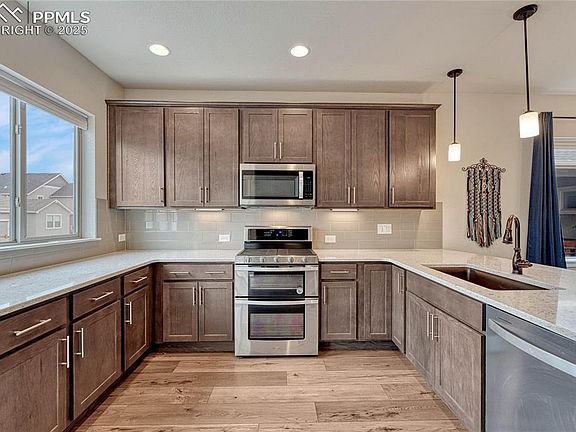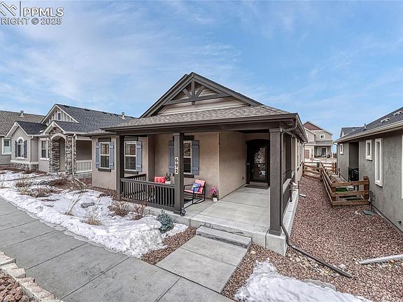 Quaint listing in sought-after Sanctuary Pointe neighborhood! *2 Bedrooms + Office. *2 car insulated garage *upgraded fireplace with stone surround and mantle *Shiplap accent wall *Low-Maintenance living *prewired for smart home *rain shower in master bath This single-owner home sits atop a hill in the shadow of ponderosa pines. Prepare yourself for the breathtaking views of the front range as you drive up to the home. If you seek a convenient and worry-free lifestyle, your search ends here. This home includes LVP flooring throughout the main areas, stainless steel appliances, quartz countertops, a stone fireplace w/ custom mantel and gas insert, including a Television and sound bar, and Smart Home wiring. Outside, discover a low-maintenance yard, a 50-year composite shingle roof, and a durable stucco exterior. Relax in the peace and quiet on your expansive covered front porch or unwind on the back patio and take in the partial mountain views. The large Master Suite features a walk-in closet with access to an encapsulated crawlspace (for extra storage) and an ensuite bathroom. The home includes a guest bedroom and bath, and a separate office with french doors. The kitchen offers a breakfast bar, upgraded backsplash, and sliding door to the backyard. The neighborhood has multiple green spaces and parks, and interconnected trails leading to Fox Run Park on the south side of Baptist Road. Enjoy community events such as food truck nights, Friday Night Socials, neighborhood garage sales, and more! Conveniently located near I-25, commuting to Denver or Colorado Springs is a breeze. This home represents a rare opportunity to embrace the quintessential Colorado lifestyle in a premier neighborhood.