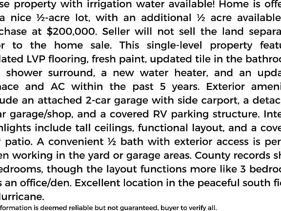 Horse property with irrigation water available! Home is offered on a nice ½-acre lot, with an additional ½ acre available for purchase at $200,000. Seller will not sell the land separately prior to the home sale. This single-level property features updated LVP flooring, fresh paint, updated tile in the bathrooms and shower surround, a new water heater, and an updated furnace and AC within the past 5 years. Exterior amenities include an attached 2-car garage with side carport, a detached 2-car garage/shop, and a covered RV parking structure. Interior highlights include tall ceilings, functional layout, and a covered rear patio. A convenient ½ bath with exterior access is perfect when working in the yard or garage areas. County records show 4 bedrooms, though the layout functions more like 3 bedrooms plus an office/den. Excellent location in the peaceful south fields of Hurricane.