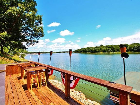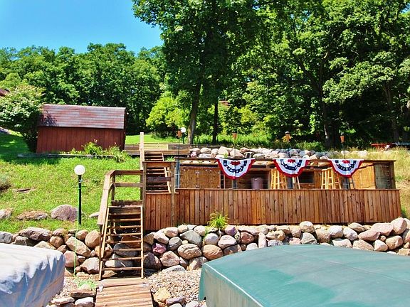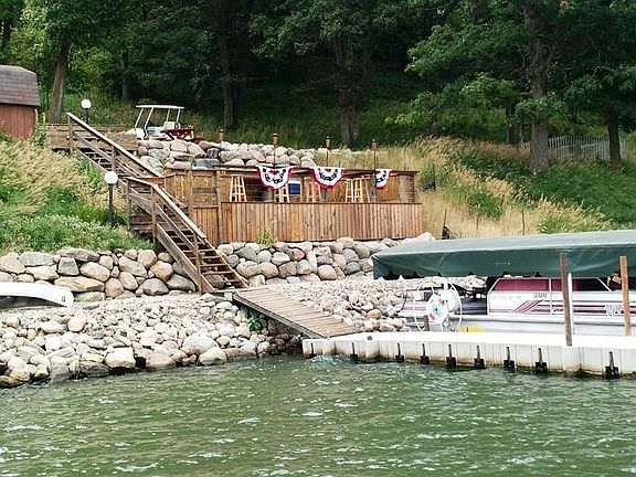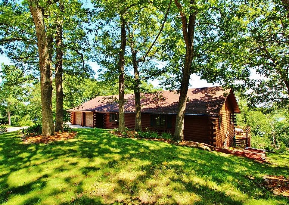Gorgeous Lakefront Log Home! Nestled in the woods on the lake's west side Main Channel (just minutes off of Hwy 44), this one-of-a-kind log cabin home is loaded with unique details and lots of privacy. With 3 levels of living space, 4-season porch, and 3 decks with gorgeous lake views, this home was designed for entertaining and easy living. Special features include loads of woodwork and beamed vaulted LR ceiling, efficient wood stove, and stone work. The open kitchen and DR overlook the LR, plus there are 3 BRs, 2 full baths, and laundry on the ML. Downstairs is a game room offering a true cabin vibe. It's just a short golf cart ride (incl) to your lakeside oasis, complete with your personal tiki bar and spectacular lake views. Built-in storage and a separate storage shed, bonfire pit, dock area and newly rip-rapped shoreline make for lakeside living at its best! It's move in ready with recently stained home exterior and decks, updated shoreline and low maintenance landscaping.