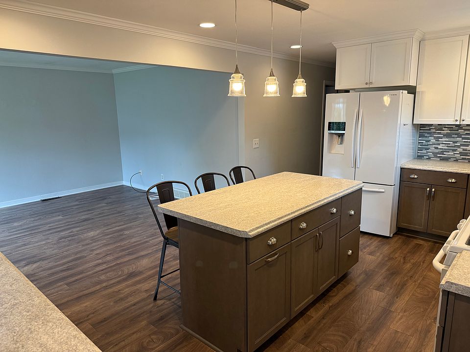 Well-appointed kitchenKitchen islandPartially fenced in backyardHardwood flooring