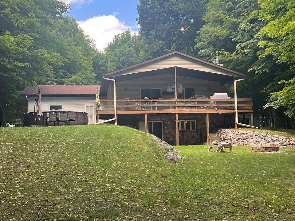 New Three Lakes Chain home on the market! 3 bedroom 2.5 bath, main level master bath, main level laundry, level sloping lot to the picturesque water views and wildlife. Home features all new kitchen "smart" appliances and new furnace. The home has a wrap around deck and patio with a bar in the lower level for easy entertaining. A warm cozy fireplace upstairs and a wood burning stove down for cool evenings. A luxurious master bath with jetted tub for relaxation and an oversized attached garage. All with over 100 feet of Three Lakes Chain frontage makes this a nice find!