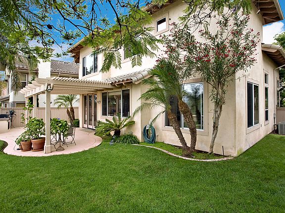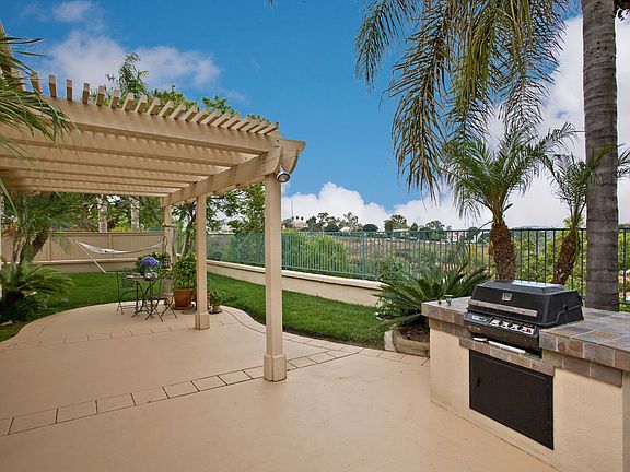 This gorgeous Aviara home offers panoramic views of the hills, mountains, and city lights along with open living areas lots of natural light. Gourmet kitchen w/ stainless steel fridge, dishwasher plus double ovens is open to the dining area w/ fireplace and French doors leading to the backyard. Hardwood tile flooring w/ carpeted bedrooms. The spacious backyard features a built-in BBQ, grassy area large patio space, perfect for entertaining. Enjoy the convenience of nearby schools, shopping, restaurants more! Recent upgrades include the following: Fresh paint inside and out, new carpet, French shutters and window treatments, fence more. Home is equipped with air conditioning.