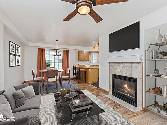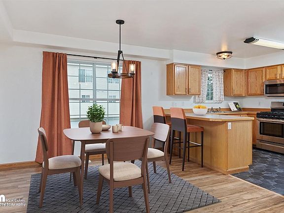 Welcome Home! Come see this beautiful townhome that has been updated for you. Close to Base, Tikahtnu Shopping, and walking distance to Creekside Elementary and Park. All bedrooms on the upper level. Lots of storage in the garage and new appliances including the washer/dryer.6923 Gold Kings Ave # B Recent upgrades and features you will love. New Renovations done in 2020: Epoxy Sealed the Garage floor. New ceramic entry tile New vinyl and grout in kitchen and bathrooms New Laminate flooring in Livingroom New trim throughout the home New living room ceiling fan and lighting All new Frigidaire Stainless Kitchen Appliances New Washer and Dryer New bathroom toilet, fixtures and vanity and paint. New carpet New bathtub and surround shower for the upstairs bathroom New toilet for upstairs, and new bathroom lighting and fixtures. 2020 Recent preventive maintenance done: Dryer vents cleaned. Windows resealed Fireplace and HVAC serviced And more minor items. Security System is owned outright from ADT. Optional cost to buyer for service should be $39 a month Wonderful features we loved and think you will too. Close to the base, shopping, churches, schools, parks and everything in Anchorage. Plenty of parks in walking distance. Great neighborhood and neighbors. Very responsive HOA and virtually maintenance free. Very comfortable floor plan and quiet. HOA takes care of all outside maintenance including snow removal! Two entry areas; Front door for guests, Garage for us. Gas fireplace, easy to turn on and enjoy for the evening or just 10 minutes in the morning with coffee. Great floor plan with all bedrooms up with large closets and good storage. Main living area is open to kitchen and guest bathroom is down the hall. Spacious Garage with lots of storage space.