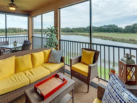 Breathtaking VIEWS inside and out! This 2nd floor GOLF-INCLUDED, Furnished Oleander model is RARE with over $30,000 of interior updates and full WATER & GOLF views with no other rooftops to spoil this panorama. The lot premium alone was $15,000 and you'll see why. While most units look the same this one sparkles with custom craftsmanship. You'll enjoy the electric fireplace accent wall, Living Room Built-In accent nooks and granite shelf entertainment unit and Breakfast Nook custom banquette with storage. The location adds endless value with an eastern exposure out the back so no afternoon sun, located next to the satellite pool and only a 5-minute walk from the Clubhouse. The original owners have never rented the unit and thought of everything from custom paint throughout, white ceilings, crown molding added in all rooms and extensive trim-work to make this a showcase that looks like a model. You'll love River Strand and MAINTENANCE FREE living in a gated community as well as all the amenities: 27-hole Golf Course, tennis, pickleball, 2 fitness centers, 2 resort style pools, 6 satellite pools, Clubhouse with newly decorated restaurant, Billiards Room & Tiki Bar! Why wait to build when you can have upgrades and views with this one-of-a-kind Coach Home?