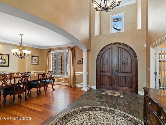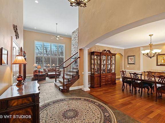 There's no place like home! This warm and inviting French Provincial style luxury residence is nestled on almost an acre, in a serene cul-de-sac setting. With over 4,750sf of main living space, and an additional 2,850sf in the finished English basement, there are so many flexible living spaces in this newer (built 2004), incredibly well-maintained home. As you enter the magnificent 8' mahogany front doors, the quality of this home is readily apparent. You'll notice the cozy den with a fireplace, perfect for settling down to work or studies. The family room's expansive floor to ceiling windows and stacked stone fireplace create an impressive feel, enhancing the coziness of the space. The family room connects to the professional kitchen and eat-in area with the two-sided fireplace, allowing you to dine by the fire. Any chef will feel right at home with the Jenn-Aire professional appliances, 8' island, abundance of custom cabinetry, and the butler's pantry with extra refrigerator. The 1st floor master bedroom is incredibly spacious (22'x14') and highlighted by a tray ceiling, plantation shutters, brand new carpeting, and a newly remodeled master bathroom with a walk-in frameless glass shower. Head upstairs via either of the dual staircases, and you'll find three more large bedrooms, two full bathrooms, as well as a huge bonus room (currently used as home office with two workstations, a hangout area, AND a workout/ballet area). Imagine YOUR possibilities here! Moving down to the English basement, you'll find a recreation room with wood burning fireplace, 5th bedroom (with full bath), workout room, and plenty of storage space. Also important to note - the oversized 3+ car garage has a stairway that leads directly to the basement utility room, making your maintenance and storage needs a breeze. Additional features: central vacuum system, water softener, dual water heaters, and zoned heat. Last, but not least, let's head outside to the 18'x18' maintenance-free deck overlooking mature trees and perennial gardens. The esteemed Turnberry community offers an 18 hole golf course, 3 golf simulators, and lakes stocked with sport fish. Very highly regarded Crystal Lake schools. Watch the professional video tour for a more detailed preview of this stylish home.