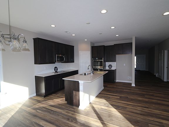 Welcome to 6923 Wheatley Rd! This impressive, 1-story home offers a spacious layout with all the convenience of single-story living. Enter from the deep covered porch or from the garage and find bedrooms 2 and 3 to your right, separated by a convenient full bathroom. Continuing along the entry hall, you will find a large laundry room on the left before entering your open-floorplan living space. A sizable center island creates a striking focal point in the kitchen and overlooks the gathering room beside it. Other notable features in this kitchen include a roomy corner pantry, stainless steel appliances, ample counter space, and beautiful finishes. Enjoy family time in in the gathering room, which features large windows and a sleek electric fireplace. The owner's suite is tucked away near the gathering room for easy access and optimal privacy. You'll be delighted by the attached bathroom with a 2-sink vanity and a huge walk-in closet.