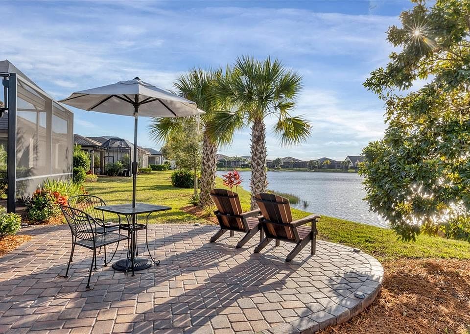 Welcome to this gorgeous, pristine and contemporary 3BR, 2BA Crestview model home on a large water view location in the desirable 55+ gated, resort community of Del Webb in Lakewood Ranch! Enjoy stunning sunset and water views from this west facing lanai and patio. Relax by the water in your covered lanai, watch TV outdoors, enjoy a meal, great entertaining space! This meticulous home has been FULLY upgraded inside and out. Upon entrance, you will know it is special with designer touches from lighting to porcelain tile floors throughout, crown molding, calming paint colors, light, bright and professionally decorated. SPECIAL FEATURES include: Kohler Whole House Generator, custom plantation shutters on all interior windows, custom permanent accordion hurricane shutters on all exterior windows (takes minutes to close versus installing panels), hurricane glass on front door, chef's dream kitchen with custom shaker style cabinetry, quartz countertops, designer tile backsplash, under and over cabinet lighting, vented range hood, gas range, Whirlpool stainless steel appliances, designer pendant lighting over large center island that provides seating for at least 4, upgraded Kohler fixture plus entire wall of additional cabinetry and countertop for lots of storage and serving space, and dining room with luxury chandelier. The master bedroom is a true retreat with tile floor, ceiling fan, crown molding, water views and en suite bathroom featuring dual sink vanity, large tiled step in shower with niche and high quality glass doors, private water closet, linen closet and walk in closet with custom built ins. The secondary bedrooms are equally as nice with the third bedroom with French door entry currently used as an office/den. The guest bath offers a tile step in shower and conveniently located to guest bedroom. The laundry room includes multiple built in cabinets and a laundry sink, how nice! Enjoy spending time on the extended screened lanai complete with electric dual Kevlar storm shades, sun shade, ceiling fan, TV, lighting, water views, surrounded by upgraded landscaping and a bonus extra patio to sit out and enjoy the sun and gorgeous views all around! Additional features: crown molding and porcelain tile flooring through entire home, ceiling fans, gas water heater, surge protector on generator and whole house, extended garage with storage racks and epoxy coated floor, upgraded landscaping around entire home! COMMUNITY FEATURES: Del Webb offers an active lifestyle with 6 tennis courts, 8 pickleball courts, 4 bocce courts, heated resort style pool and lap pool, spa, on site restaurant, amazing clubhouse where many events and activities happen, state of the art fitness and group fitness center, craft room, billiards, catering kitchen, Wi-Fi cafe, library, lifestyle director, firepit and fireplace area under cover, walking trails, dog park, satellite pool and many clubs and organized events. Location is close to many grocery choices, festivities/restaurants at Lakewood Ranch Main Street, golf courses, and a short drive to area beaches like Lido Beach, Anna Maria, Siesta Key and downtown Sarasota, Bradenton and St Petersburg. Also, close to the UTC and Waterside LWR areas. Local airports at Tampa (TPA) and Sarasota (SRQ) and are a reasonable drive. This home and community have it all and are a must see today!