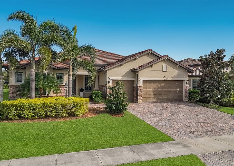 Enjoy the ultimate Southwest Florida lifestyle in this beautifully appointed and sought-after Pinnacle floor plan in Lakewood Ranch’s maintenance-free and amenity-rich Del Webb 55+ community. Wood-look plank tile floors, crown molding and window shutters are found throughout. This one-level open plan with 2,511 square feet is ideal for entertaining and everyday living flowing seamlessly between the great room, dining area and kitchen, where you’ll find a generous counter-height island with seating, spacious granite counters, under-cabinet lighting, stainless-steel appliances and walk-in pantry. Disappearing glass sliders in the great room open to the expansively extended paver lanai, featuring ample covered and open areas with a breathtaking panoramic screen showcasing views of the picturesque backyard. The private owner’s retreat features a tray ceiling, massively large walk-in closet and lovely bathroom suite with dual vanities and an oversized shower. Two additional guest bedrooms are on a separate with with two additional full baths providing comfortable accommodations for overnight guests. Other highlights of this fabulous residence include a separate office/den with double entry door., a 3-car garage with built-in shelves and ceiling racks for storage, and a laundry room with a sink, counter and cabinets. You’ll find an active, social lifestyle in Del Webb, which offers an array of amenities, including a large lakefront clubhouse with restaurant, two pools, tennis, pickleball and bocce ball courts, fitness center, walking and biking trails, and more.