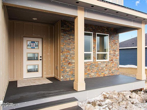 High Ceilings, Welcoming entry, covered front porch w/ spectacular mountain views a& sunsets! 8' x 4.5' Quartz kitchen island, double ovens. Spacious & well thought out. Huge walk in pantry. Office area , 5th bedroom or Family room can be made out of one of the extra rooms. Highly sought after Neighborhood, great schools, easy commute to JBER or Anchorage with No traffic lights. 12-4 Open