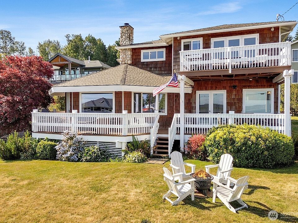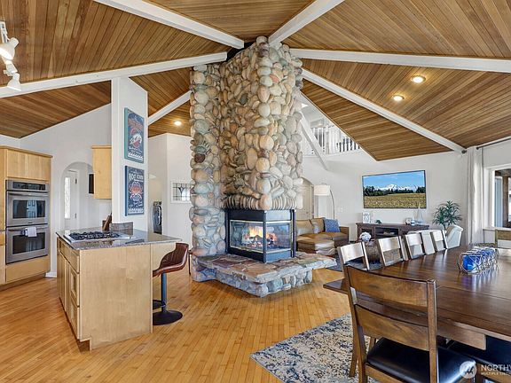 PRICE IMPROVEMENT! Now $925,000, this Birch Bay showpiece blends striking design with exceptional value. Over $75K in upgrades plus $36K in furnishings (included) make it truly move-in ready. A soaring radial wood ceiling with exposed beams converges at a dramatic river-rock fireplace, creating a lodge-like feel that’s both warm and architecturally stunning. Living spaces on both levels open to decks with sweeping bay, mountain, and sunset views—perfect for gathering with family. Main-level primary suite with deck access, updated granite kitchen, new roof, central A/C, flooring, and renovated decks. Walk to your private beach or golf-cart to parks and restaurants. Proven short-term rental or ideal summer retreat for snowbirds.