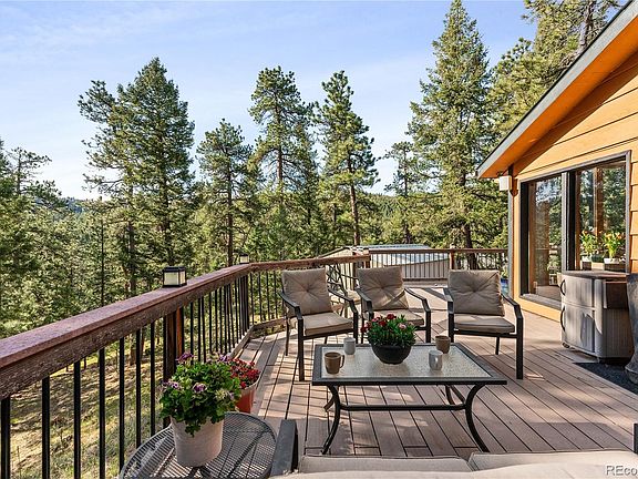 Welcome to your Evergreen haven, nestled among towering pine trees and surrounded by lush native grasses and wildflowers. The updated kitchen boasts granite tile countertops, custom pine cabinetry, a spacious center island, and an additional built-in buffet for extra storage. The gleaming tile backsplash, highlighted by under-cabinet lighting, and barstool counter seating, add to the kitchen's modern appeal. Opening up to a vaulted living room, this space is accentuated by wood beams and an updated wrought iron railing. An Earthstone wood stove efficiently warms the main floor. Adjacent to the living room is a versatile dining room area with skylights and massive windows, it currently houses a piano, but could be great for a variety of functions. The large wrap-around deck offers a private, soothing retreat great for relaxing, dining al fresco, and enjoying the Colorado nature and skies on 3 sides of the home. The main floor master bedroom is a warm and inviting retreat featuring a fireplace, a custom walk-in closet. an updated master bath with a spacious shower and vessel sinks. A secondary bedroom enjoys ample space and views as well as the full hallway bathroom. The lower level includes an office with gorgeous built-in shelves, window ledge, peace and quiet. The rest of the walk-out basement features a full bath with a jetted tub, grand 9' ceilings in the two walk-out bedrooms, and incredible family/media room~plus bonus exercise/card room area! Stay toasty warm with thermostat controlled propane wood stove. New paint and carpet in the basement add the finishing touch to this remarkable home. The home's private driveway, shared with only three other residences, ensures exclusivity and seclusion. Large shed and numerous storage closets you will not lack for storage space. You'll love the quick access to hiking at Maxwell Falls, & downtown Evergreen. Private drive serves only 5 homes. Very quiet and private, no through traffic. The mountains are calling you home!