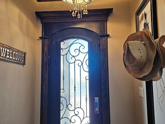Private iron-door entryLarge formal diningCovered patiosWhite woodworkPale gray walls