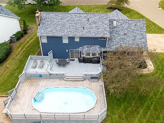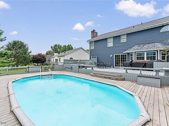 Discover Your Dream Home! Perfect for Entertaining and Relaxing! Welcome your guests to a relaxing outdoor oasis featuring a spacious two-tiered deck and a sparkling swimming pool — the ideal setting for memorable gatherings and tranquil weekends. Nestled in a highly sought-after neighborhood on a desirable corner lot, this beautiful home offers a three-car side-entry garage and impeccable curb appeal with lush landscaped grounds. Step onto the inviting front porch and enter a bright, welcoming foyer that offers a breathtaking view of the backyard pool area. The spacious living/family rooms flow seamlessly together, creating the perfect space for entertaining or relaxing with loved ones. Moving into the heart of the home, you arrive at the kitchen — a true chef’s dream. Designed by Hartville Hardware, featuring custom cabinetry, sleek countertops, stainless steel appliances, a double oven and wine fridge...imagine preparing meals here, or gathering with friends around the island. Adjacent to the kitchen, is a versatile bonus room with charming barn door entry and wainscoting. Currently used as an office, it could easily become a first-floor bedroom, playroom, or craft space. Off the kitchen is the convenient laundry area, pantry and powder room. Upstairs, you'll find four generous bedrooms, including a luxurious owner’s suite with a private sitting area—perfect as a nursery, office, or reading nook—a grand bathroom, & large walk-in closet. The large finished lower level offers the perfect gathering space, perfect for game or movie nights, including a well-designed bar area to serve your guests!