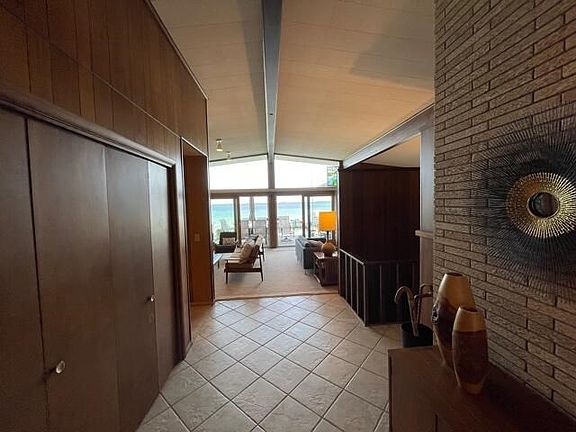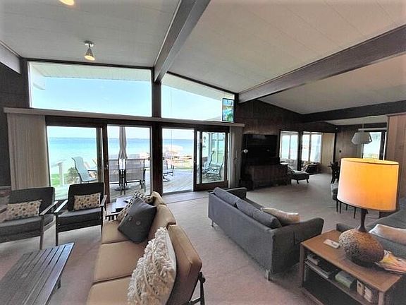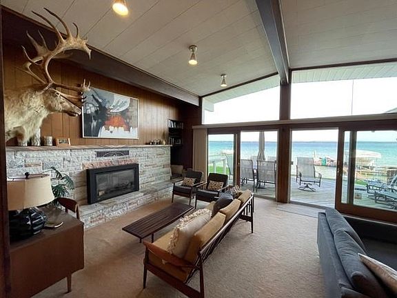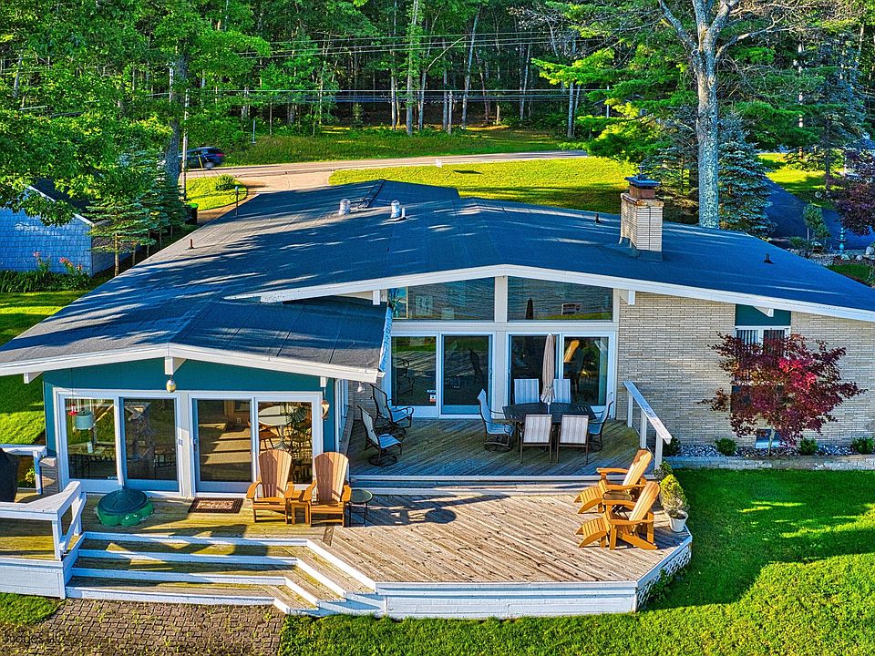 97 FEET of gorgeous Higgins Lake frontage on the ''Gold Coast'' with pure sand lake bottom and great water depth for boating and swimming. This brick home features a California Ranch style and spectacular views with walls of glass in the spacious, open living areas including the bright sunroom with panoramic views of the lake. Expansive decking and brick pavers highlight the exterior. 4 bedrooms, 3 baths, approximately 2,500 square feet of living area, full basement, 2-car attached garage. Includes 106x186x90x100 lot across the street for extra parking or future additional garage or guest house.