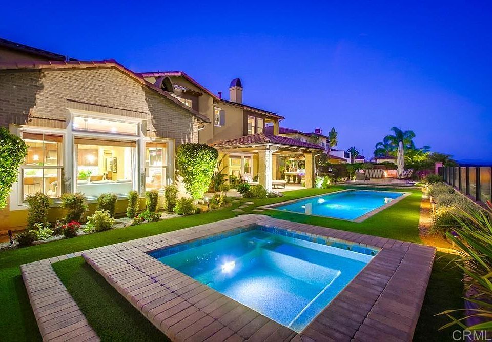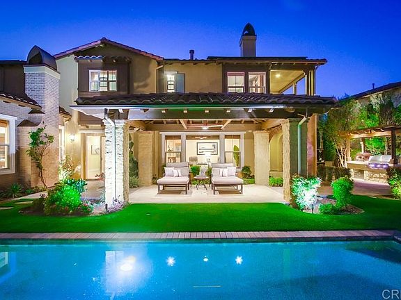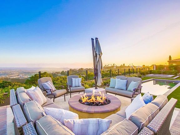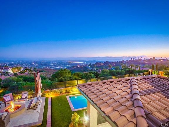 ONE OF THE MOST IMPRESSIVE VIEWS IN LA COSTA! This beautiful residence in the exclusive LA COSTA RIDGE neighborhood sits on a rarely available cul-de-sac location with an elevated, premier southwest facing lot. Located within a gated community, this home boasts stunning views of the ocean, canyon, and city lights. This property offers 5 bedrooms, each with their own bath and a full bedroom/bathroom downstairs. The backyard is an entertainer's dream. It features open outdoor spaces with a saltwater pool, jacuzzi, built-in BBQ, fire pit and a pizza oven. The beautifully landscaped private entry courtyard with it's own fire place offers an additional outdoor space for sharing times with family and friends. Whether you're hosting a gathering or enjoying a quiet evening at home, the outdoor amenities provide the perfect setting. The kitchen cabinets have recently been refinished with a new double oven. Dual dishwasher, custom island with sea foam granite countertops and GE monogram appliances. The walnut flooring, custom crown molding, two large wine cabinets and lighting throughout the home add to its elegance. Additionally, there are four fireplaces, solar panels paid in full, an EV charging station and a large 3 car garage with and ample storage. The home is equipped with several additional amenities - a water filtration system, tankless water heater and security system. The large master bedroom with retreat is particularly impressive, offering amazing views from its deck. The upgraded black cabinets in the master bathroom, along with marble counters and floors adds a touch of luxury. Plenty of flex space throughout the open floor plan to serve your lifestyle - whether it be work from home or entertaining family and friends. Close Proximity to the Omni La Costa Resort, Four Seasons/Park Hyatt Aviara and excellent schools nearby. This spectacular property is a must see!
