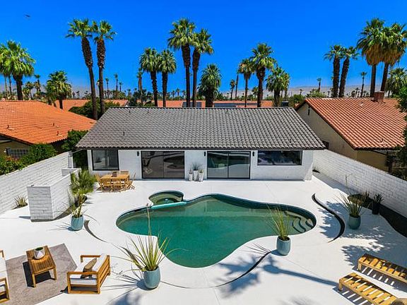 Seller wants to make a deal! Bring an offer. Fully custom home within a quiet, no HOA neighborhood-offering a combination of privacy and convenience, just moments from the heart of Rancho Mirage & Palm Springs. You are welcomed with a 30-ft marble stone walkway that sets the tone of high-quality design of the home. Step down as you reach the living space, the open-concept floor plan impresses with vaulted ceilings, smooth-finish drywall with a spray paint finish, and wide-plank white oak LVP flooring. Perfectly situated on a large north to south lot, the space is comfortably filled with natural light during the day and enhanced by dimmable LED recessed lighting at dusk. Thinking of adding an ADU? This is the perfect large, interior lot. The chef's kitchen is a true centerpiece, featuring a professional-grade ZLINE dual fuel range, a sleek waterfall-edge oversized island with a built-in wine fridge, and a stunning 10-foot architectural window showcasing breathtaking backyard views. Custom white oak cabinetry with 9-ply birch boxes and drawers, luxury quartz countertops by Tile Designs by Fina, European brass fixtures, and a limestone backsplash complete this gourmet kitchen. Custom designed by Nicholas Lawson, a Coachella Valley local designer. Retreat to the primary suite with an en-suite bathroom featuring 360-degree designer tile, walk-in shower featuring dual solid-brass tower faucets, picture window with a view of the private backyard, copper penny tile flooring with copper glass grout. Both bathrooms feature a large walk-in shower, smart toilets with bidets and auto-open, and double sink vanities with solid brass fixtures. Expansive 10-foot sliding glass doors open effortlessly to a private backyard oasis, complete with a sparkling PebbleTech pool, tiered entertaining zones, and a cool-technology coated deck perfect for warm desert days. All of this set against the dramatic backdrop of the San Jacinto Mountains. Additional upgrades include a brand-new 18.5 SEER2 high-efficiency electric heat pump with a 10-year compressor warranty for added peace of mind. Centrally located near sought-after destinations including Cotino - Disney's Storyliving community, world-class golf, upscale dining, and premier shopping, this home delivers luxury desert living with zero compromises. Staging can be purchase