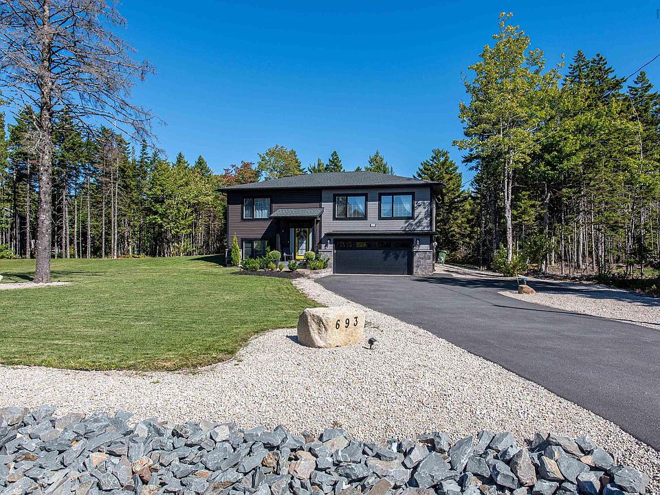 Welcome to 693 Midnight Run; a like-new, modern split entry sitting on a private and level 1.2 acre lot in highly sought-after Indigo Shores! From the moment you arrive, you’ll fall in love with the beautifully landscaped lot along with the curb appeal. When you step in side, you’ll start to notice the little details as you’re greeted with a hardwood staircase and custom feature wall. The top floor boasts a large open concept main area featuring a white shaker kitchen with quartz countertops and stainless steel appliances leading into your dining room and large living room with a custom electric built-in fireplace and an upgraded 18,000 BTU ductless heat pump for comfort and energy efficiency. Down the hall you have 3 of the 4 generously sized bedrooms along with the main 4pc bathroom. The large primary suite features a walk-in closet and 4pc en-suite with a double quartz sink and upgraded tile shower. Downstairs is flooded with natural light since the level grading of the lot allows for larger than average windows. This space adds up to a total of 2,264 square feet and features a large rec room with another 18,000 BTU heat pump, 4th bedroom, den (currently set up as a workout space), laundry room and 3rd full bathroom along with the entrance to the double car garage. The beauty in this property is seen from above. Sitting on 1.2 acres with complete privacy from your neighbors with a huge level yard that’s perfect for a growing family which is beautifully landscaped with an oversized back deck and a large paved driveway. A house and lot of this beauty at this price range doesn’t come around often in Indigo Shores so book your showing today!