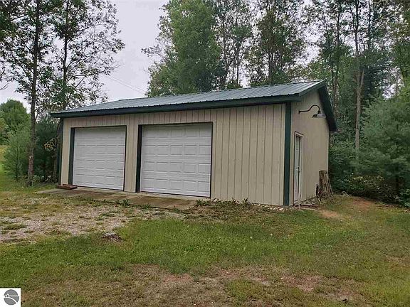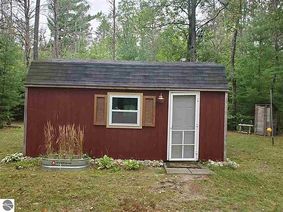 This unique 10 acre property is for the guys as well as the girls and kids! It features 3 cute, tiny rustic cabins, a 24x36 garage, state land is a few hundred feet away and directly across the road with snowmobile and atv trails and several lakes just a few miles away! One of the cabins features a 1/2 bath and loft, another is a gathering area that is multi-purpose. It could be a bar or food prep area with seating for indoor dining, or what ever your needs are. There is rain water collection used for the outside shower and pump toilets that empties into a holding tank. You can also connect a RV to this! Electric is run under ground to all the cabins and garage ran by a small Honda generator. The firepit, free standing deck and shooting range is also there for your enjoyment!