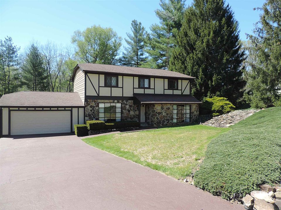 First time on the market. This meticulously maintained one-owner Tudor Style home is situated east of town on approx. 1/2 acre and offers many amenities. Main level boasts formal living room, den, laundry room, half bath, large eat-in kitchen with updated quartz countertops and french doors overlooking the back patio. Upper level is complete with 4 BR and 2 full bathrooms. Nice storage throughout and two car attached garage. Virtual Tour or Video tour available.