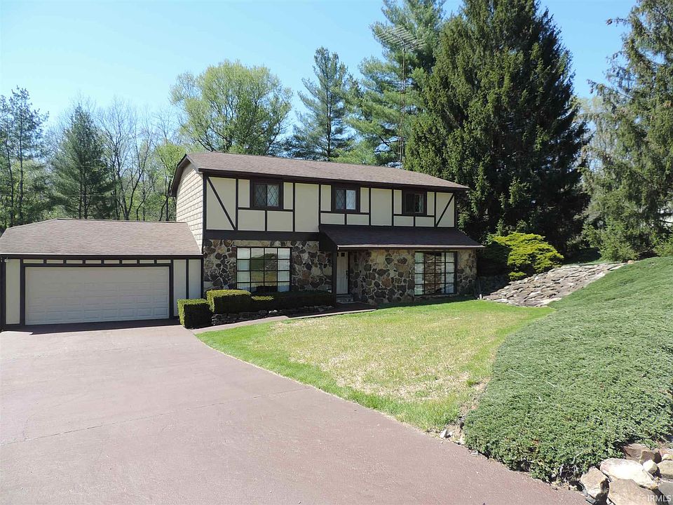 First time on the market. This meticulously maintained one-owner Tudor Style home is situated east of town on approx. 1/2 acre and offers many amenities. Main level boasts formal living room, den, laundry room, half bath, large eat-in kitchen with updated quartz countertops and french doors overlooking the back patio. Upper level is complete with 4 BR and 2 full bathrooms. Nice storage throughout and two car attached garage. Virtual Tour or Video tour available.