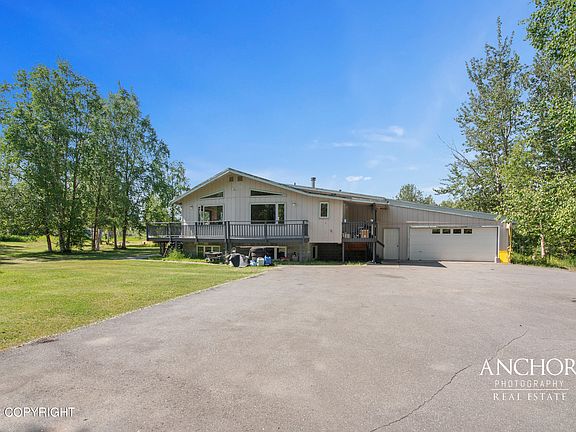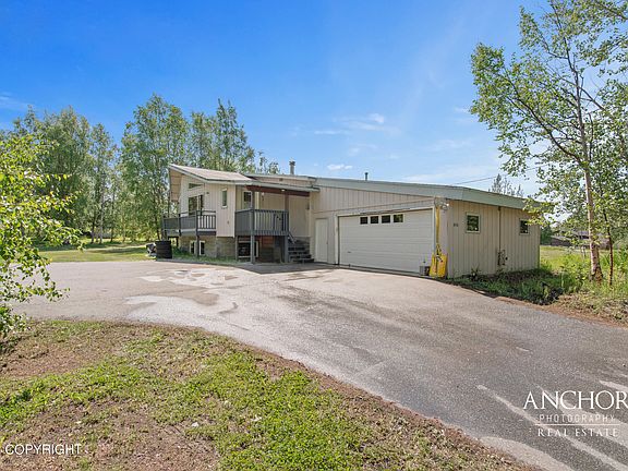 This large home at over 3000 sq.ft. has so much to offer. Near Mat-Su Regional Hospital and about 30 minutes to JBER. This beautiful and rare property sits on 1.78 acres with quick access to the Parks highway. It is zoned for residential and commercial use, so bring your business! This is also a horse property. Plenty of space for a garden. The large windows bring in the most amazing light.The yard is level and has mature trees surrounding the grass. It has oak hardwood floors and tongue and groove ceiling. The house has built in shelves, custom designed kitchen and quartz counter tops, and wrap around deck. The circular driveway offers plenty of parking and easy trailer turn around home needs a buyer who is looking to gain sweat equity and has the ability to give it the TLC it requires. It is being sold AS-IS. The home is priced below tax assessed value. It has a root cellar under the storage shed.