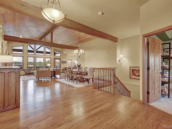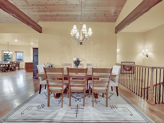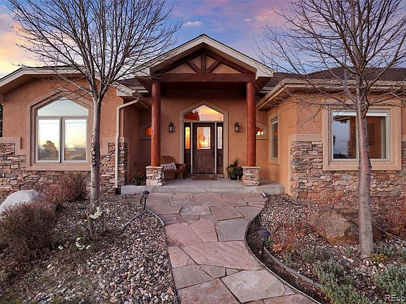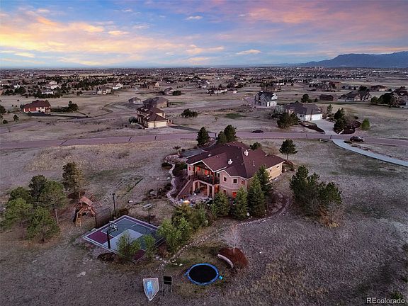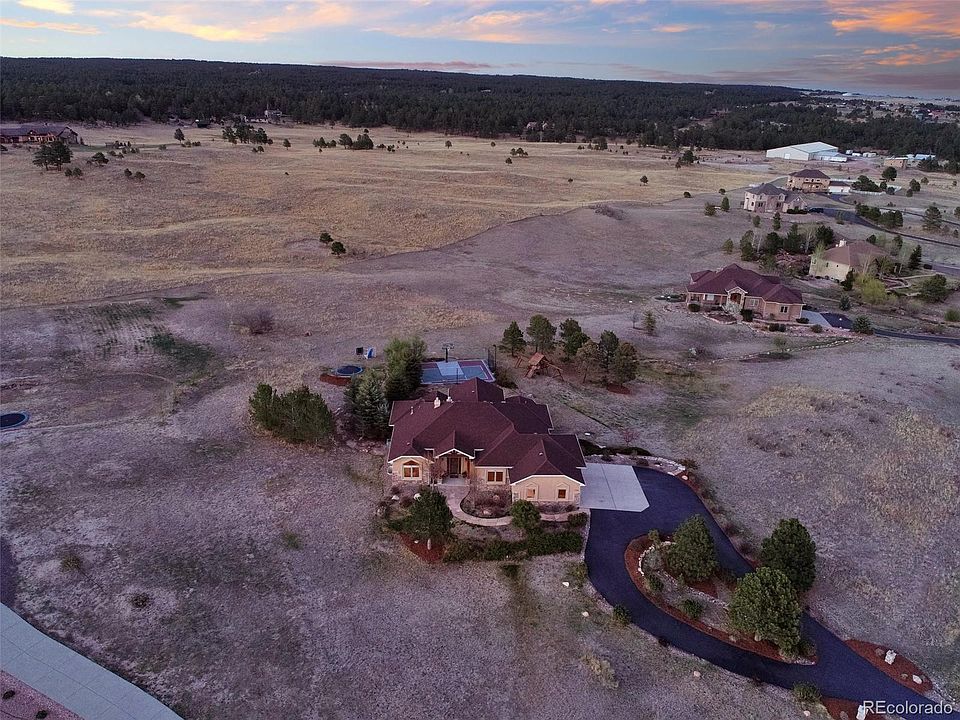 This one of a kind, former Parade of Homes winner, sits on a private 2.56 acre lot with amazing views of Pikes Peak and the Front Range. This gorgeous ranch style home with walkout basement features 5 bedrooms, 6 bathrooms, an office and upgrades around every corner. Tongue and groove vaulted ceilings in the great room, refinished wood flooring on the main level, beautiful granite countertops and newer stainless steel appliances. The master bedroom features coffered ceilings, double sided fireplace, 5 piece bath, large walk-in closet and access to the back deck. The main level also offers an additional bedroom with private bathroom and walk-in closet, large office with french doors and spacious laundry room. Heading down to the basement you will be greeted by a large wet bar equipped with dishwasher, beverage cooler and mini refrigerator. Second master suite and 2 additional bedrooms w/adjoining bathroom and walk-in closets. Private workout or bonus room. There’s plenty of space for your favorite games such as foosball and a pool table with an abundance of natural sunlight! Stepping out onto the back patio you are welcomed by a large water feature, fire pit, built-in trampoline, sport court and beautiful landscaping. The large 3 car garage offers built in cabinets and epoxy flooring. Driveway was repaved in 2021. Brand new 75 gallon water heater. Close to shopping, restaurants and schools. This home has so much to offer!