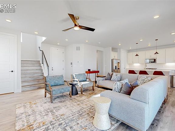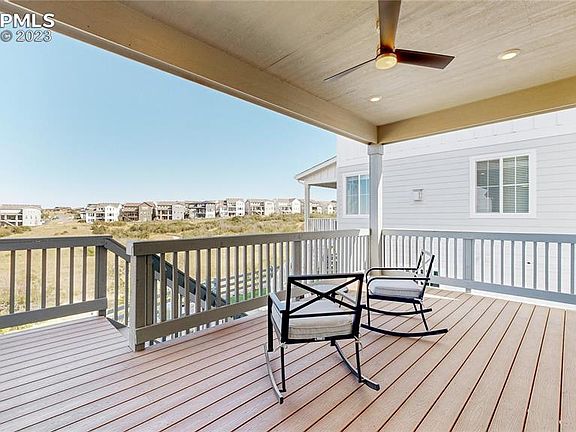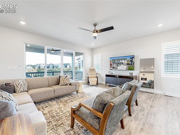 Perfectly situated in The Wild Oak and backing to a greenbelt/open space with trails, this 4 bedroom, 4 bathroom, home offers you approximately 2,892 finished square feet of living space. Step inside and be greeted by the model-like features, including beautiful luxury vinyl flooring and custom updates throughout. The family room welcomes you with double sliding doors leading to the covered back deck overlooking the spacious greenbelt/open space. Back inside, the open floor plan provides the perfect layout for relaxation or entertaining. The kitchen is a dream with beautiful quartz countertops, white cabinetry with satin brass hardware, tile backsplash, center island with farmhouse sink, pendant lighting, and countertop seating. Upstairs, you'll find a fantastic loft space with luxury vinyl flooring and shutter window coverings. The primary suite is a haven, featuring luxury vinyl flooring, abundant natural light, a designer ceiling fan, a walk-in closet, and a stunning en-suite bathroom with charcoal colored tile flooring, dual sink cabinetry with quartz countertop, and a large glass door shower with tile flooring and surround. The second floor is completed by two additional bedrooms, a full bathroom with stunning upgrades, and a conveniently located laundry room. The finished walk-out lower level is completed with updated carpet, designer ceiling fans in the family room and additional bedroom, and a full bathroom. The covered back patio offers an additional space to enjoy the outdoors. Move right in with no stress of needing to complete landscaping in this new community since it is already done for you! The Canyons is a new and highly sought after neighborhood that offers an array of amenities, including trails, parks, a resort-style community pool and hot tub, and a community coffee house just a short walk away from this amazing home.