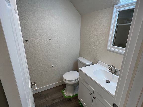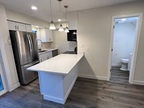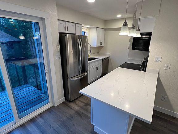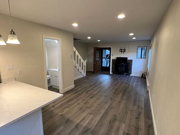 Brand new hardwood floors. Brand new carpet. Brand new sliding glass door. Fresh paint through entire home. New washer and dryer. Recently renovated kitchen with stainless steel appliances. Open floor plan downstairs with living, dining & kitchen space. Two bedrooms with closet doors, full bathroom with double vanity & washer/dryer upstairs.