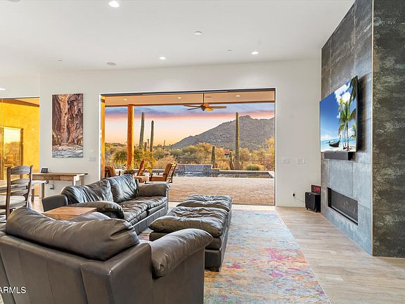Discover this custom built home, designed to blend modern living with nature. From the moment you step through the custom designed metal front door, you are welcomed by expansive windows in the living room that frame majestic mountain views. Glass doors slide open to extend the living space onto a spacious, covered patio along with a sparkling pool. Views in the backyard include Desert Awareness park.The kitchen, custom-designed with entertaining in mind, is both functional and elegant, offers high-end finished and plenty of space to host gatherings.This home also features an oversized three-car garage with ample overhead storage, Air-conditioned and a RV garage with 30 amp. Both garages have newly finished floors.