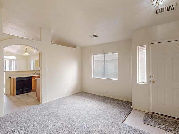 Fabulous 3 bedroom plus office/flex space, 2 full bathrooms and two car garage ranch style home in Enchanted Hills Rio Rancho! New Interior paint! New carpet in bedrooms and living areas. Flexible floorplan with two separate living areas, cathedral ceilings, arched doorways and plant shelves. New wood look flooring in Kitchen, plus abundant counter top space and a breakfast bar. Primary owners suite features 2 closets, cathedral ceilings, double sinks and tub/shower combo. Close to neighborhood park, shopping, schools and restaurants. Mature trees in front yard.