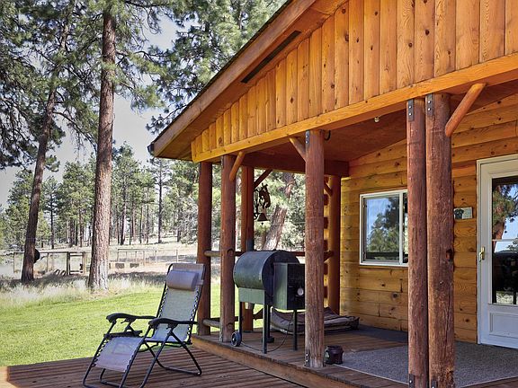 Sitting on over 9 private acres adjacent to Deschutes National Forest land, this well-maintained property offers a quiet setting just minutes from Sisters.The home with log cabin siding stays comfortable with central heating & cooling, and wood-burning fireplace. The kitchen features Stainless Steel appliances. Outside, the front deck and back patio with hot tub offer plenty of space for outdoor living. The 1920 sq ft barn has stalls and two 24x12 hobby rooms. Additional outdoor features include: multiple covered parking areas, garden with drip system, greenhouse, dog kennel, and poultry coop. The property is fenced and cross-fenced. The back half of the property offers a build site with easterly views. The roof is less than 5 years old and the exterior of the home, including decking, was re-stained in 2021. Enjoy the peaceful setting of the forest while being close to town.