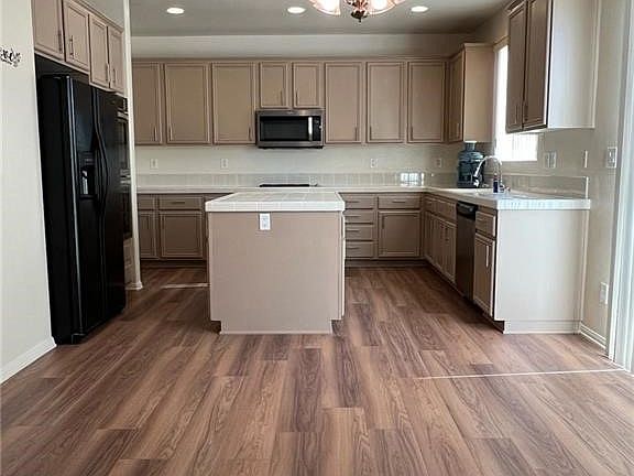 a chef’s delight with a convenient kitchen island and ample cabinet space. The adjoining family room is warm and