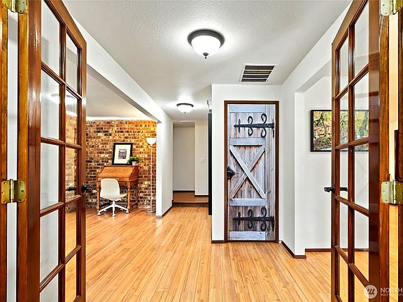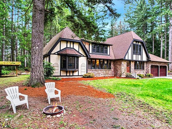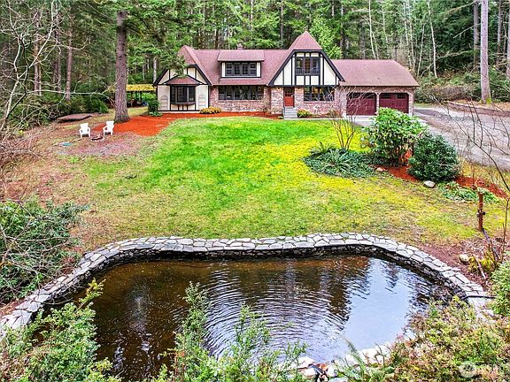Experience the charm of this one-of-a-kind Tudor-style home, perfectly blending classic elegance w/ modern convenience. Stunning 3-bedroom home offers main-level living, w/2 bonus rooms upstairs, one featuring a closet for added flexibility & the other w/ a home theatre, projector, 6.1 speaker system, subwoofer & receiver. Primary suite boasts an ensuite bath & a WIC w/ custom built-ins. Central AC & a cozy pellet stove for efficient heating & cooling. Nestled on 2.46 gated acres, enjoy lush gardens, a serene pond, & a sprawling deck perfect for entertaining. Explore picturesque trails, w/ Banner Forest Heritage Park, Olalla Bay, & Long Lake just moments away. Conveniently located near Southworth Ferry & Highway 16. RV hookup wired & ready!