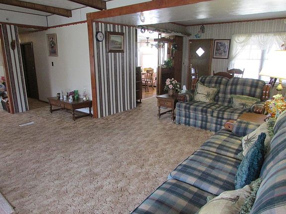 Almost 2.5 acres of gorgeous land! Home is very livable. This 3 bedroom, 2.5 bath home has large living area, den, 2 dining areas, and covered front and back porches. There are 2 garages attached to the home with paved drives, a vinyl-sided outbuilding, a red barn and a couple smaller outbuildings. The back 1.4 acres is fenced and would be great for horses. Another idea might be to build a newer home back there! This style of this home is unusual and can't be financed with a traditional mortgage. Ask you Realtor for more information. All appliances remain with home and some furniture may be left too. Cash only buyers please. Home sold in as-is condition, seller unwilling to make repairs.