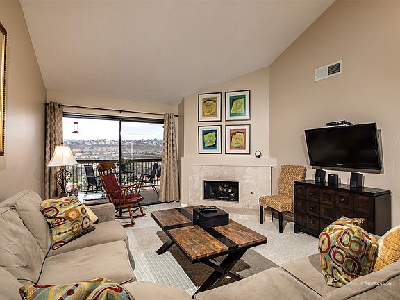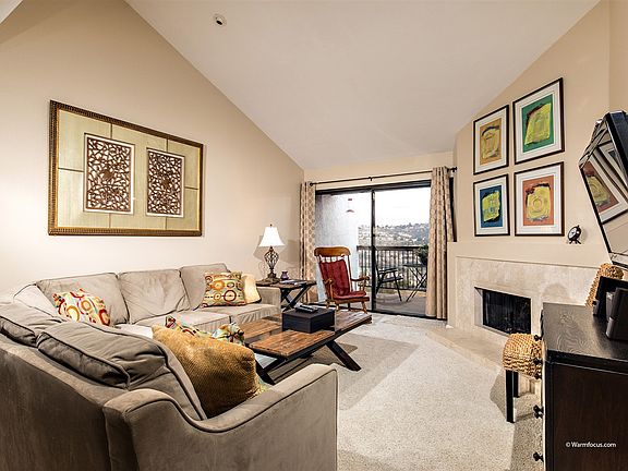 MAGNIFICENT GOLF COURSE VIEWS. TOP FLOOR END UNIT. QUIET cul de sac. WALK to great restaurants, movie theatre and Carlsbad library. Quiet well-maintained community. Move-in ready. NEW CENTRAL A/C and ceiling fans. DRAMATIC HIGH CEILINGS. Light and airy. Garage and parking space. Community Pool and Spa. Extra storage loft in garage and on balcony.
