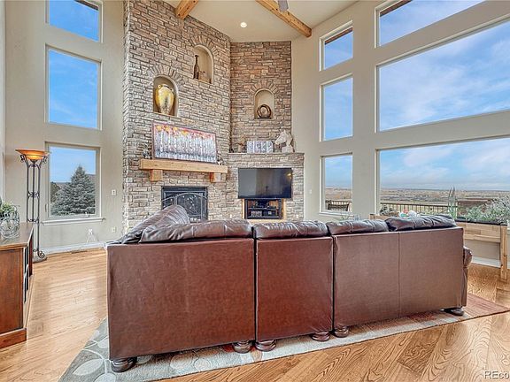 Escape to true Colorado living in this stunning custom-built home on a private 2-acre lot, ideally situated in a quiet cul-de-sac with sweeping mountain and sunset views. Step through the grand foyer into a family room with soaring ceilings centered around a dramatic stone fireplace. The main level flows seamlessly into a breakfast nook & chef’s kitchen, complete with premium stainless steel appliances, including a six-burner gas range with griddle, double ovens, & a sleek hood vent. Nearby, relax in a cozy hearth room or enjoy privacy in the main-level office.