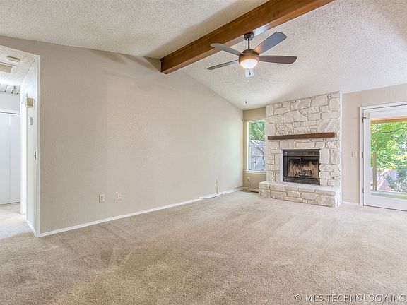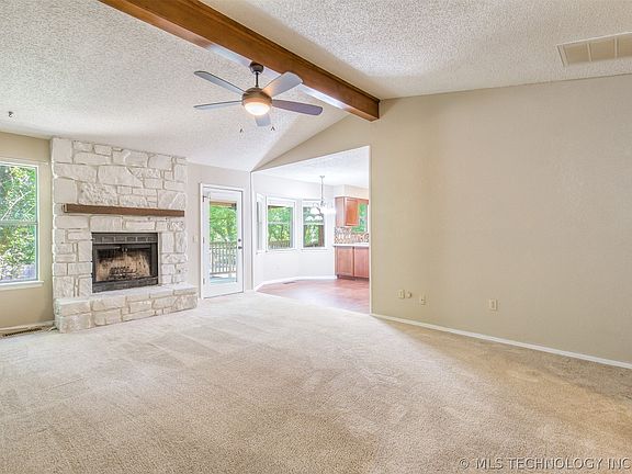 Stone "cottage" nestled onto wooded greenbelt lot in great South Tulsa location! Vaulted Living Room with woodburning fireplace opens to Breakfast Nook with bay window & Kitchen overlooking private, treed yard. Updated Kitchen featuring Kraftmaid cabinets w/soft-close doors & drawers, updated Baths, neutral carpet, wood-look vinyl floors. Incredible views from the covered deck w/ceiling fan. Dead-end street, Jenks Schools. Move-In Ready!