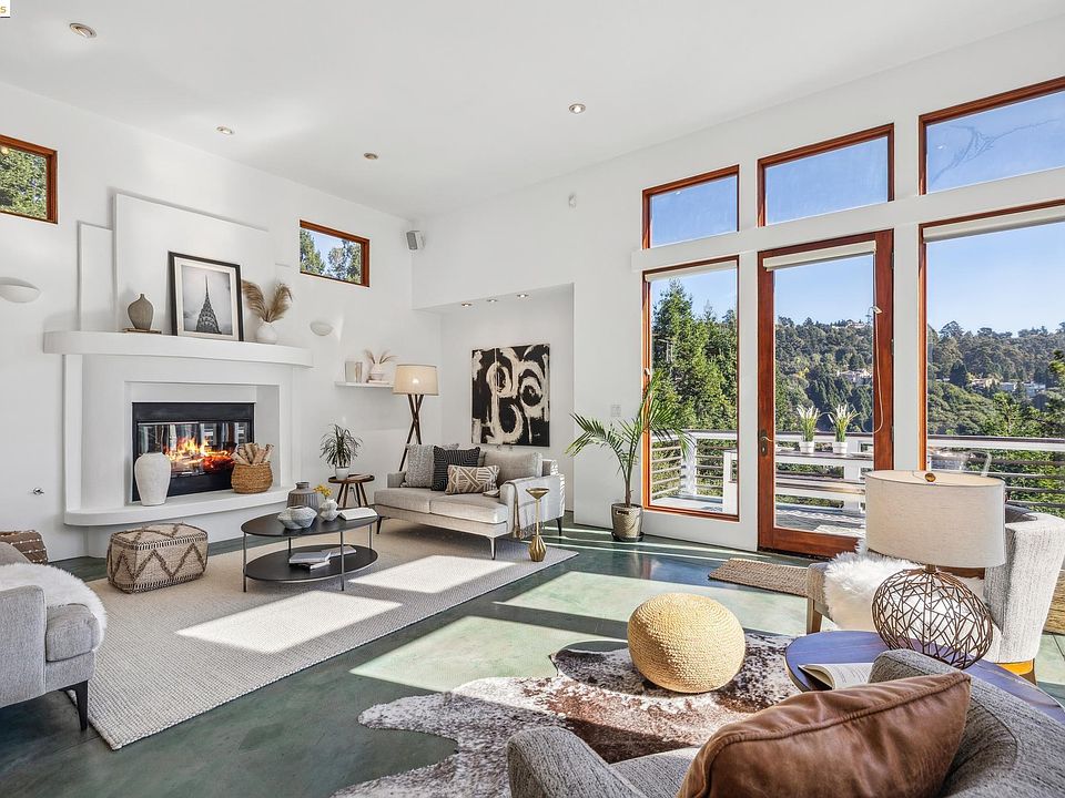 Striking modern architecture with floor-to-ceiling windows, extra tall ceilings, an open floorplan and verdant views in the Claremont Hills! The spacious 4BR/3BA home welcomes you with a front courtyard and the sounds of a tranquil fountain. The open floorplan combines kitchen, dining and living space with soaring ceiling height, and open to the main deck with canyon views. The Chef's Kitchen impresses with premium appliances and an island breakfast bar. The lower level houses a lavish Primary Suite and second bedroom with its own ensuite bath, and the laundry room. On the entry level, a large bedroom, full bath, and a flex room opening to the courtyard and garden access. 2-car garage with interior access and lots of storage.