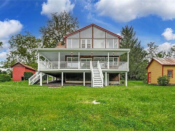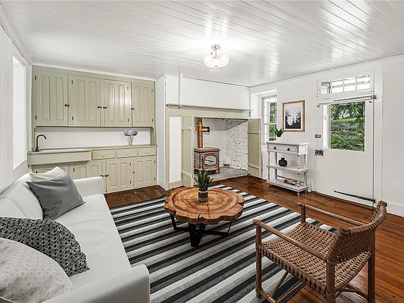 Own a piece of history in this stunning stone home built circa 1823. Exposed beams, deep silled windows and random width wood floors mingle with modern amenities for the ultimate in luxury country living. Surrounded by acres of tall trees, and bordered by farmland, Sycamore Hollow is a rural retreat. Entry begins with a covered porch and deep-set doorway. Dining and living areas at the front of the house include a walk-in fireplace with wood stove, and built-ins for storage. The generously-sized kitchen, part of a more recent addition that was remodeled in 2023, offers soft-close cabinets, quartz countertops and stainless appliances. A wall of windows looks out over the deep backyard, while the remodeled breakfast area leads out to a fabulous wraparound deck. Upstairs, the primary bedroom serves as a quiet oasis, with vaulted ceiling, walk-in closet, and newly remodeled en suite bath. Three more spacious bedrooms share an updated hall bath. Outside, more than 14 acres of wooded and cleared land boast a spring fed pond and access to Ontelaunee Creek. Outbuildings include a summer kitchen, garden sheds, and a large equipment garage. History and modernity collide here at Sycamore Hollow, located close to shopping, dining and commuter routes.