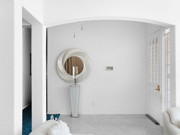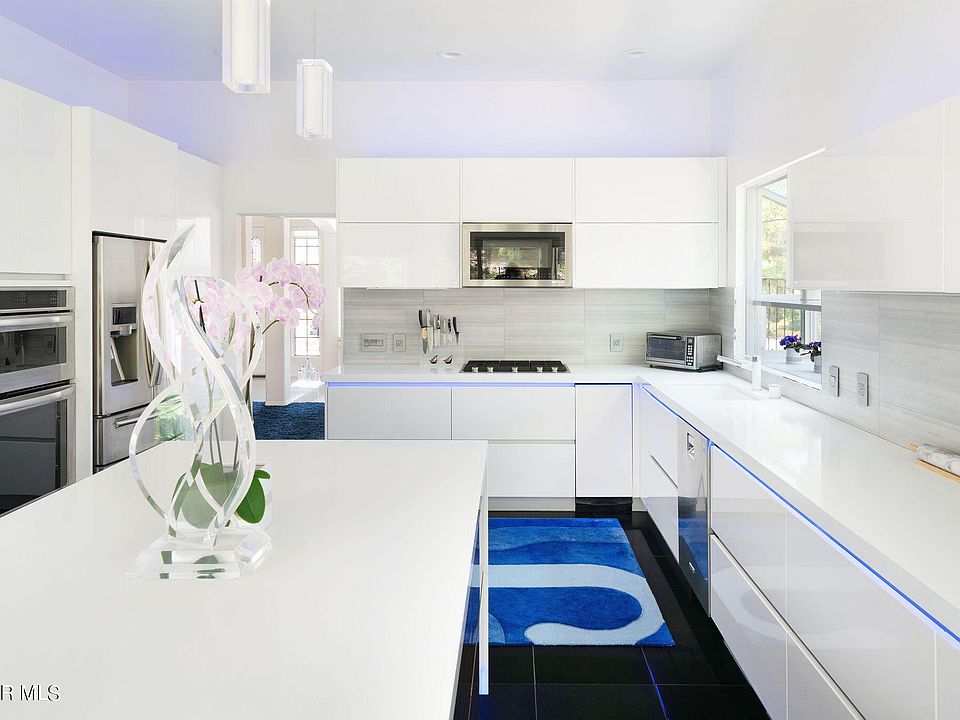 It's as if The Guggenheim landed squarely in your kitchen! Who gets this? One special buyer will, that's who! The original Hawk Crest semi-custom model home on the market for the first time! There are so many beautiful elements that have gone into this home. The artistic quality of the German made cabinetry is beyond compare. Perhaps it's the combination of high-gloss materials in highly architectural forms that achieves this one of a kind, ultramodern sophistication. It's been said 'Life's most precious moments are spent in a place of perfection,' and precision is one word that comes to mind when describing this incredible single story home. With 4 bedrooms and 2 remodeled baths, literally soaring ceilings and a spacious 3 car garage, this home is much more than 4 walls and a roof, it is itself a work of art. Perhaps it's the gleaming tigerwood lowers contrasting the high gloss white uppers, the pristine white quartz counters, the funky-cool neon blue under cabinet lighting or the absolute black granite floors that excites the senses so. Maybe it's the stainless steel appliances or the enormous kitchen island that is so enticing, or could it be the contemporary lighting or fireplace detail? This is such a cool home!! And as if that weren't enough, this corner lot has tons of privacy, a gorgeous rock trimmed swimming pool and artificial turf yard. No HOA dues either! This truly is a masterpiece that some lucky buyer will soon call home and it's nothing short of breathtaking.