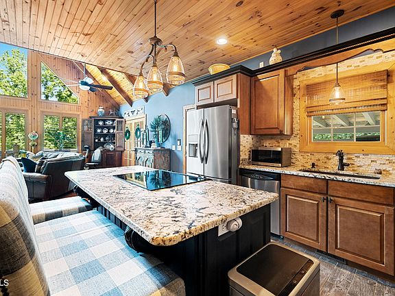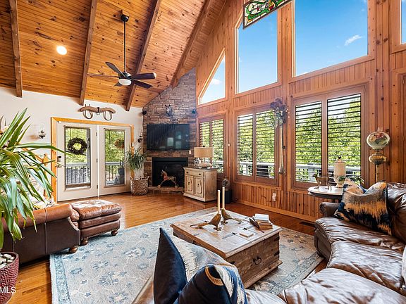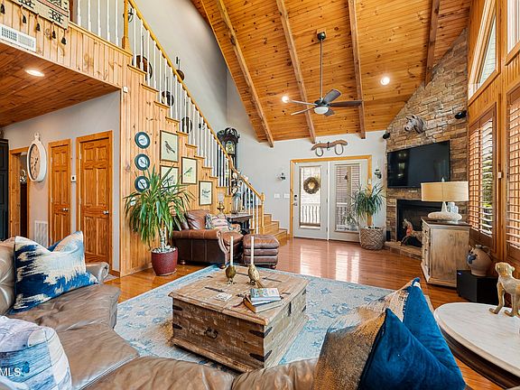 Price Improvement. Motivated Seller! Immaculate home, designed to live in, with beautiful Norris Lake view. It would be wonderful for full-time living, a second home, or for a VBRO. You will love all the natural light throughout. New Deck, New Roof. Authentic Hardwood floors, steps & risers! Vaulted Tongue & Groove Ceilings! Solid wood doors w/rustic trim. Wood Plantation Shutters. New tile in kitchen & bathrooms. New wide plank wood flooring in the Master Bedroom. The Master bathroom features a tiled walk-in-shower. New ceiling fans. The kitchen features light Cherry Cabinets, a new sink, and disposal, stone backsplash, and new Leathered Granite counter tops. The Water Heater is new along with new carpeting in the two upstairs bedrooms, plus new decking off Bedroom 2. A Double sink vanity in the upstairs hall bathroom as well. There is a beautiful dining room/stunning sunroom, or whatever you decide to make it. The grounds will delight your eyes in every direction with lovely flower beds. A walk-out basement with a covered porch downstairs keeps you dry and in the shade. Enjoy the stone firepit on cooler evenings. The outside area is plumbed for a hot tub. There is golf cart garage or can be used as additional garden storage space if preferred.. Take a short golf cart ride to Stardust Marina located behind the home, for good food, and live entertainment. The roof was replace in 2022. A proactive Seller who has taken great care to maintain this property. Boat slips are available through Stardust Marina. Welcome Home!