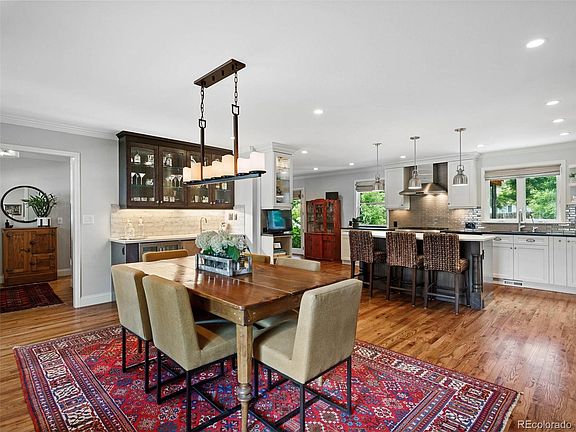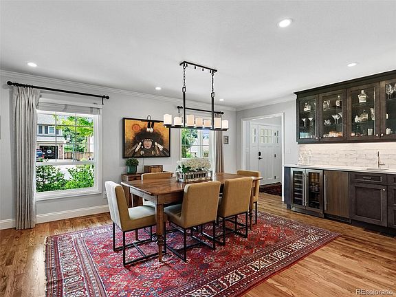 Perfectly situated in the heart of Homestead in the Willows and across the street from the neighborhood’s North Pool and tennis courts is this stunning remodeled two-story 4 bedroom, 4 bathroom home. Upon entering is a spacious dining/living room complete with a fully equipped wet bar. The hub of the home is the remodeled gourmet kitchen with Thermodor appliances including a 6 burner gas cooktop, double ovens and a built in refrigerator as well as soapstone and quartz countertops on a large center island. Beautiful hardwood floors, crown molding, custom light fixtures and window coverings as well as new interior paint are seen throughout the home. The kitchen flows seamlessly to the inviting family room with a huge picture window providing an abundance of light, a gas fireplace and a built-in desk area. The upper level offers three generously sized bedrooms (1 ensuite), two updated bathrooms, a laundry room with built-ins and a fabulous primary suite (4th upper level bedroom) featuring vaulted ceilings, ceiling fan, two walk-in closets and a 5-piece bathroom with an oversized steam shower, tub and dual sinks. The finished lower level includes a spacious recreational room, designated exercise room, game room / optional 5th bedroom and storage. A highly sought after room in the house is the covered patio, perfect for lounging in year round with the custom glass retractable doors, vaulted ceiling, skylights, heater and TV overlooking the large private yard with mature landscape and beautiful perennial gardens. An adjacent side patio and built in firepit also provide the perfect place to entertain. This central location provides great access to the Open Space, green belt, pool and tennis courts not to mention walking distance to award winning Cherry Creek School-Homestead Elementary.