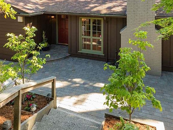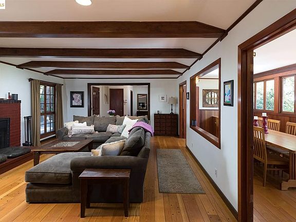 This captivating 3 bedroom, 2 bath home is the perfect blend of style and architecture in combination with its surroundings. Enter through a private garden setting to the welcoming entry. Once inside, hardwood floors, beamed ceilings and impressive woodwork set the stage for this comfortable and inviting home. The large, eat-in country kitchen leaves nothing to be desired, and opens to a large outdoor patio - the perfect environment for indoor/outdoor entertaining. Natural light pours through the living room with fireplace while the adjacent formal dining room opens to a large deck overlooking canyon views and the level yard and outdoor kitchen below. Two bedrooms and full bath with soaking tub and stall shower complete this level. Currently occupied by a fairytale master retreat with adjacent nursery, the downstairs level once featured a family/entertainment room with wood burning stove, bedroom, full bath and laundry room. Don't miss the workshop below the garage!