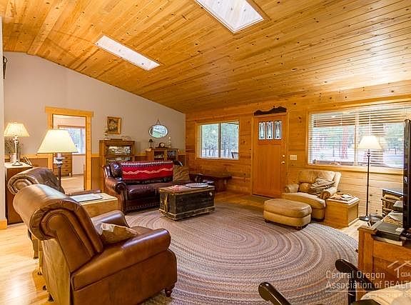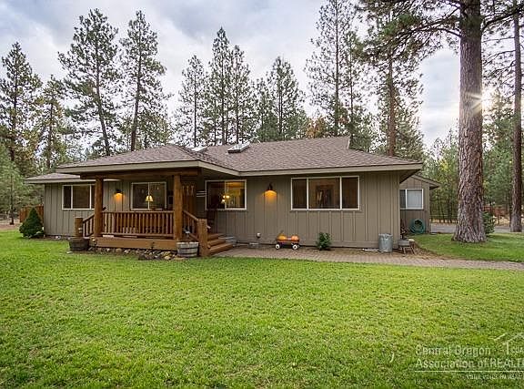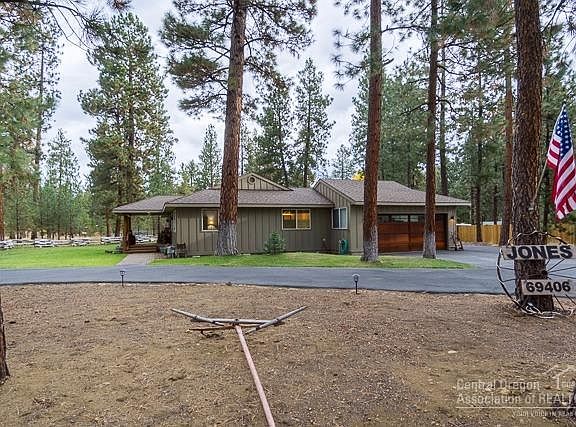 Welcoming, light & bright single-level home in desirable Tollgate, Sisters, Oregon. 3 Bedrooms, 2 Baths, 1,620 sq.ft. on a large .55 acre lot set back from the road. Great room has vaulted ceilings, wood floors, wood ceilings and wood accents with updated molding and door trim. Cedar wood and log accent covered front porch and large back deck with fully fenced yard. Stand-alone 12'x16' out building great for home office, workshop, hobby room, playroom or more. Heat pump, A/C & Pellet Stove to stay cozy!