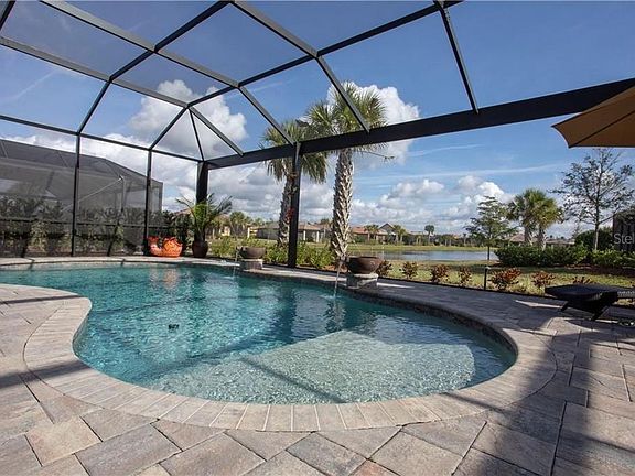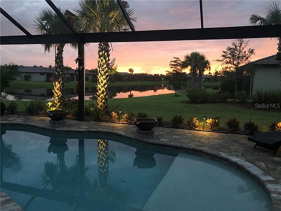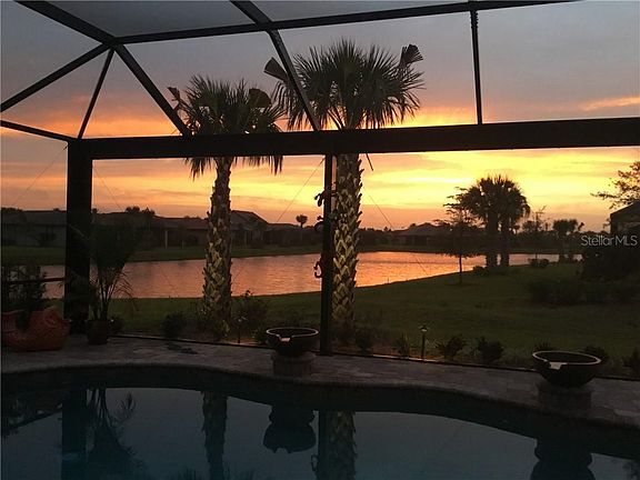 nEW PRICE $629,990 -. Live in Maintenance Free Del Webb Lakewood Ranch - Magnificently poised with pond view, this luxurious Pinnacle/Stellar pool home is available now. Enjoy an expansive lanai with private pool, outdoor kitchen and uninterrupted view of the pond and spectacular sunrises. The home offers 3 bedrooms and 3 bathrooms with a plethora of exquisite upgrades and design features. The open floor plan allows for a seamless view from the fabulously designed kitchen and great-room with built in entertainment center, to the inviting pool. The custom plantation shutters, specialty sliding curtain on the sliding glass door, wainscoting and crown molding give an elegant touch to the home. An over-sized garage and shelving provides ample room for your cars, collections and golf cart. Del Webb Lakewood Ranch is a desired +55 community with a clubhouse, resort style pool and spa, fitness room, tennis, pickle ball and poolside restaurant. There are numerous clubs and socials planned by activity manager. Don't wait and build, save money and move into this Beautiful Home and wonderful community. Museums, parks, beaches and airports, along with golfing and restaurants are just a short drive from your new residence. Don't wait and build, save money and move into this Beautiful Home and wonderful community.