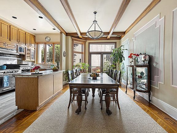 The parlor floor features a large, sun-filled living room with oversized bay windows, a library, a dining room with coffered ceilings, a renovated kitchen, and a powder room for convenience. The open layout kitchen showcases stainless steel high-end appliances, stone countertops, and recessed lighting. A sliding glass door and a custom oak window at the rear of the home fill the space with natural light and overlook the serene, country-like backyard and garden, perfect for sipping your morning coffee or hosting your next BBQ.