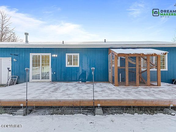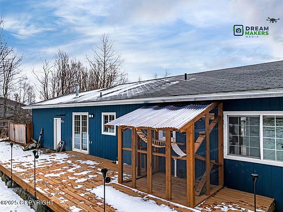 MULTIPLE offers, highest and best due Feb 20 by 5PM. This comfortable home has a vaulted ceiling, a warm blue kitchen for a cheery vibe, and two XL decks--perfect for enjoying Alaska's bright summers and sunsets. A gas fireplace adds warmth, and a fenced yard provides privacy. Plus, cat lovers will adore the custom-built catio! Recent flooring updates add to the home's appeal.Step into comfort in this inviting home featuring a vaulted ceiling and a warm blue kitchen that radiates charm. The living space extends outdoors with two oversized decks perfect for BBQs, extra seating, and soaking in Alaska's long summer days or breathtaking sunsets. Cat lovers will adore the custom-built catio off the rear deck, complete with a ramp, shelves, and a suspended rope walkway. No cats? Use it as a private, protected space instead! Inside, cozy up by the gas fireplace on cool evenings, and enjoy the convenience of a fenced yard. With much of the flooring recently updated, this home is move-in ready and waiting for you!