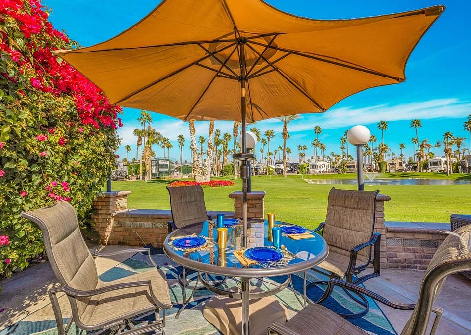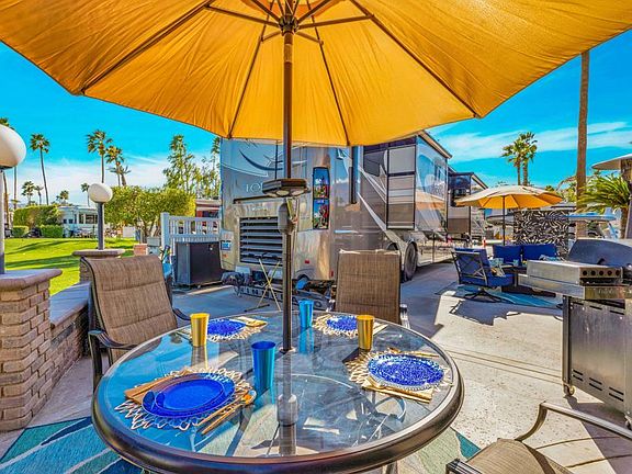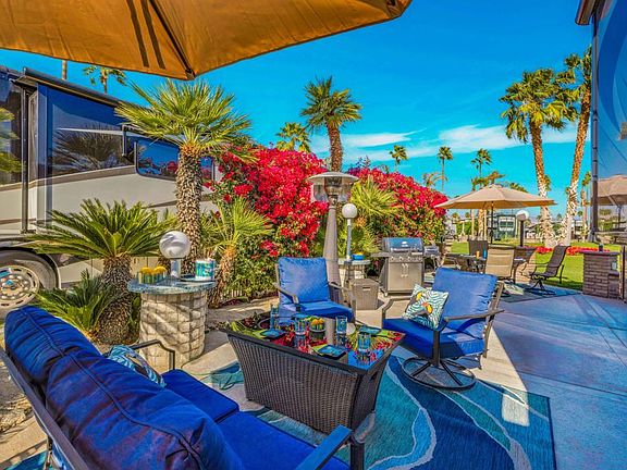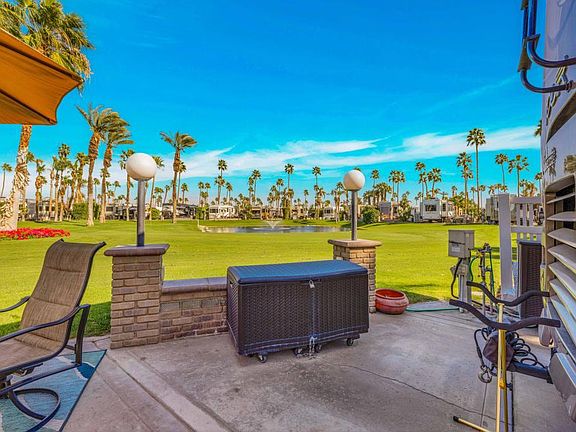 Experience the pinnacle of Palm Springs golf course living on this exquisite expanded lot nestled on the coveted back 9. Immerse yourself in breathtaking views of the verdant fairways, majestic mountains, and a shimmering fountain. Conveniently located near the El Saguaro Clubhouse, the golf starter shack, and a wealth of resort activities, this property offers the perfect blend of tranquility and convenience. Mature hedging creates a private oasis on the patio side, enhancing the sense of seclusion and relaxation. Beautiful lighting enhances the landscaping, transforming evening dining into a magical experience.Includes all patio furniture and BBQ! Outdoor Resorts Palm Springs is a Five Star RV Resort Community combining luxury with affordability. It is a guard gated resort that sits on 137 beautifully landscaped acres with 27 holes of executive golf, 10 tennis courts, 13 pickleball courts, 8 swimming pools, a fully equipped fitness center, sports bar, beauty salon/barber shop, full-service restaurant, convenience store, 2 club houses, activities, special events and so much more!