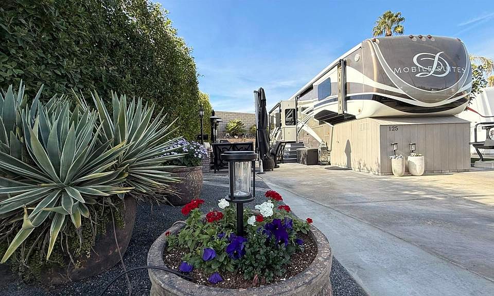 Lot 125, Lovely landscape and lighting provide the perfect entertainment space across from the front 18 golf course on the westerly perimeter of Outdoor Resorts. A beautiful 36’ 2017 Mobile suites model is offered separately (please inquire for pricing). Lovely landscape and lighting provide the perfect entertainment space across from the front 18 golf course. Outdoor Resort Palm Springs (ORPS) is a Guard Gated 5-Star RV Resort Community offering an active and luxurious lifestyle featuring golf (27 holes), tennis, pickleball, swimming and more! Two clubhouses, fitness center, beauty solan, La Roma Restaurant on campus, dog park and more!